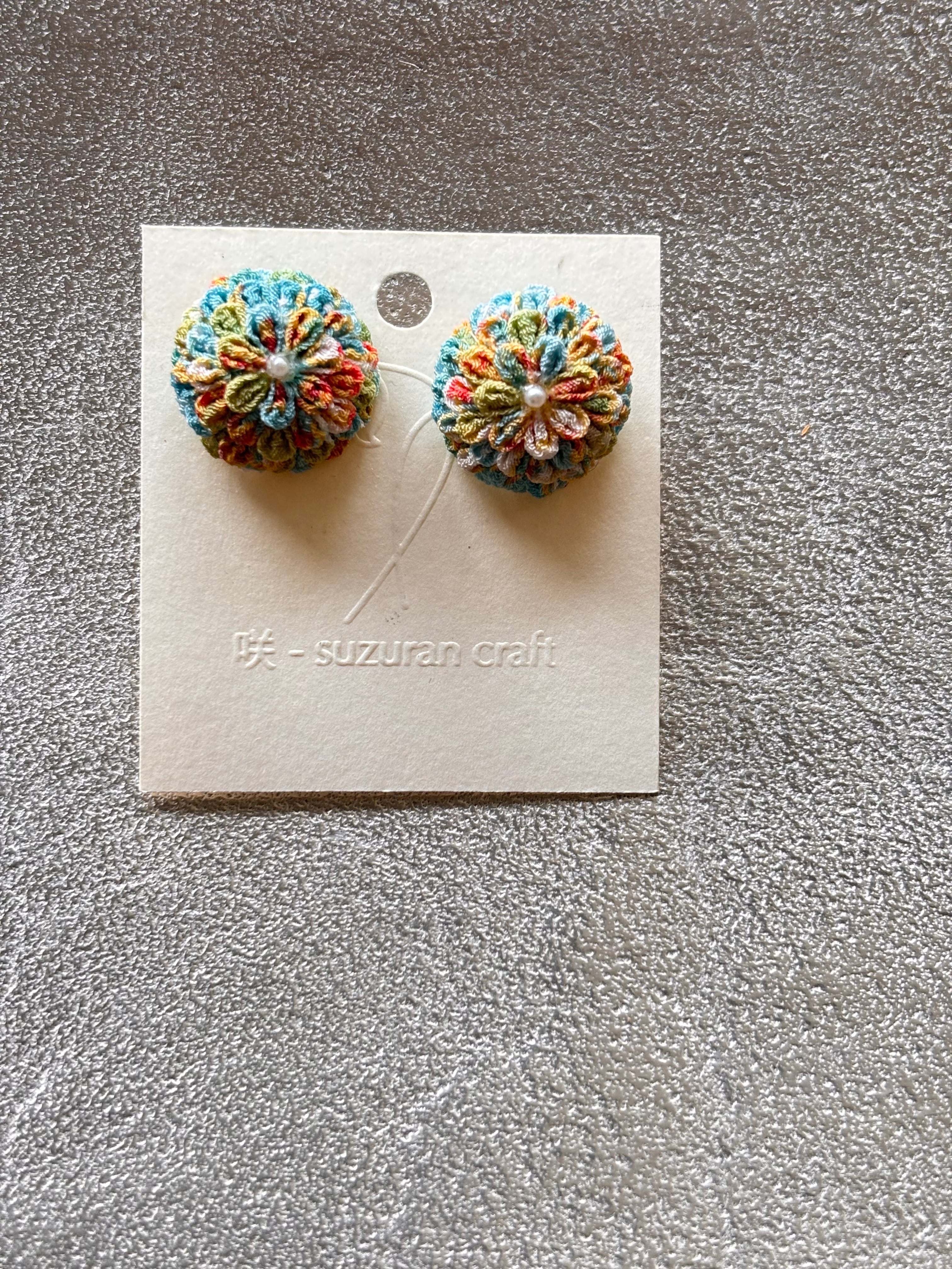耳たぶに優雅な花を飾るようにつける「こでまりピアス」です。さわやかな配色が可愛らしさを引き立て、お顔全体に華やかな印象を与えます。手作業で丁寧に仕上げられたこのピアスは、1点1点が個性的で、まさに世界でひとつだけのアクセサリーです。和装はもちろん、洋装にもぴったり合うデザインで、様々なシーンでご活躍いただけます。片耳の重さは約2gと非常に軽く、長時間の着用でも快適さを保ちます。直径は約2.5cmで、さりげなく存在感を放ちます。