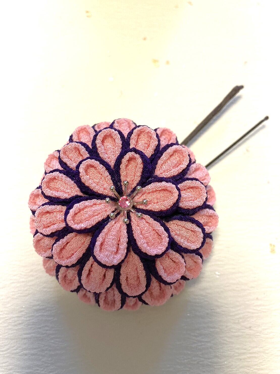 紫のカメリア風の飾りには3本の下がりついています。歩くたびに下がりが揺れるのもポイントです。