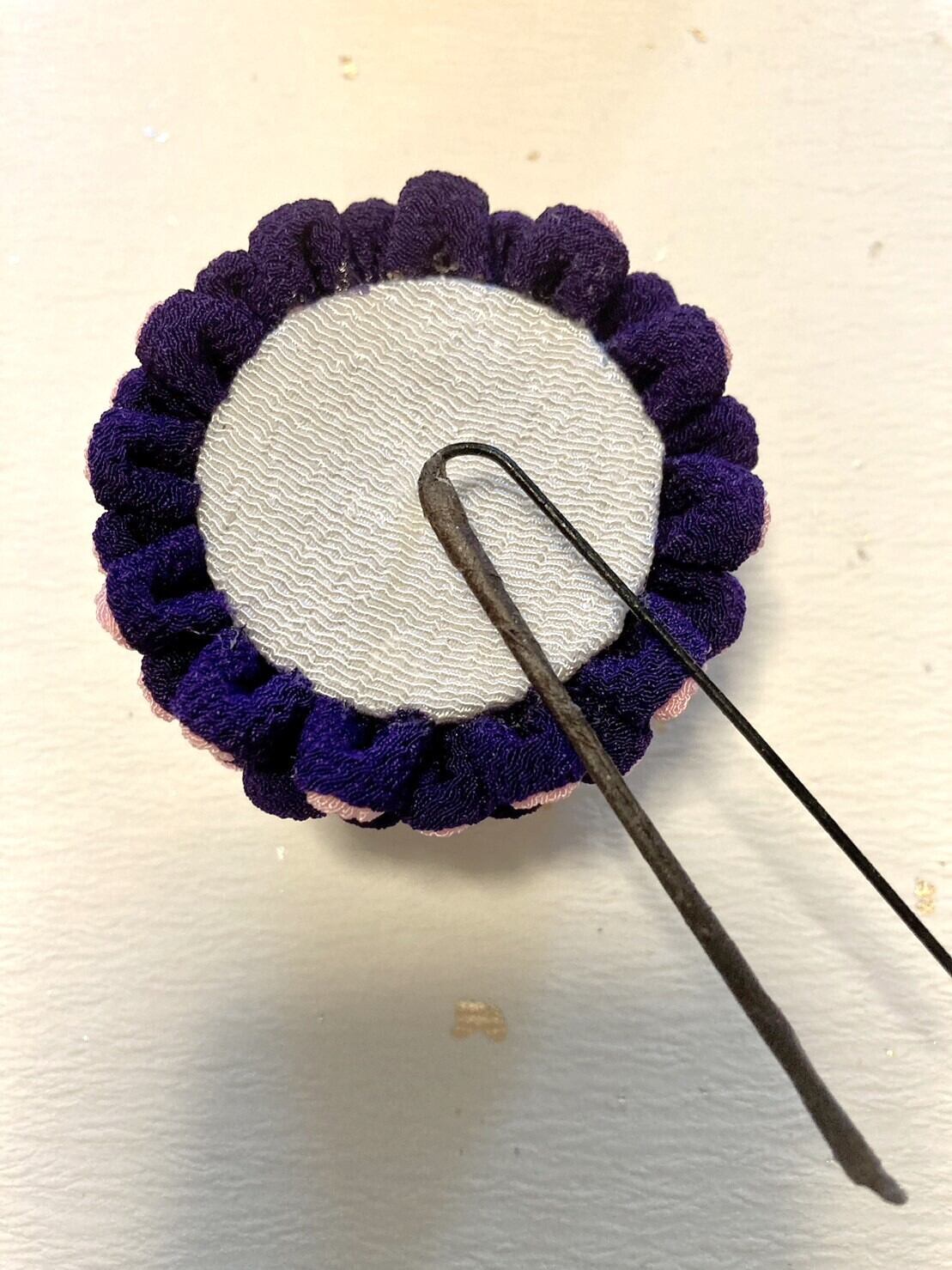 レーヨンちりめんを使用しています。形が潰れることがないよう保管いただきますようお願いいたします。また水分や湿気は避けるようお願いします。お花の角度を調整するときは、根本を優しくゆっくり動かして少しずつ調整して、お花が正面を向くようご調整ください。