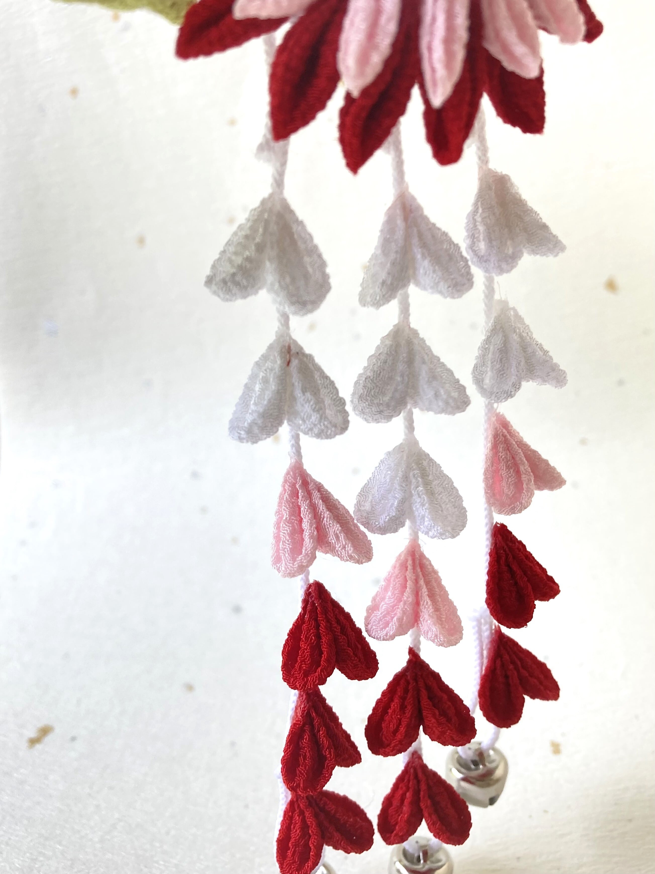 レーヨンちりめんを使用しています。形が潰れることがないよう保管いただきますようお願いいたします。また水分や湿気は避けるようお願いします。お花の角度を調整するときは、根本を優しくゆっくり動かして少しずつ調整して、お花が正面を向くようご調整ください。