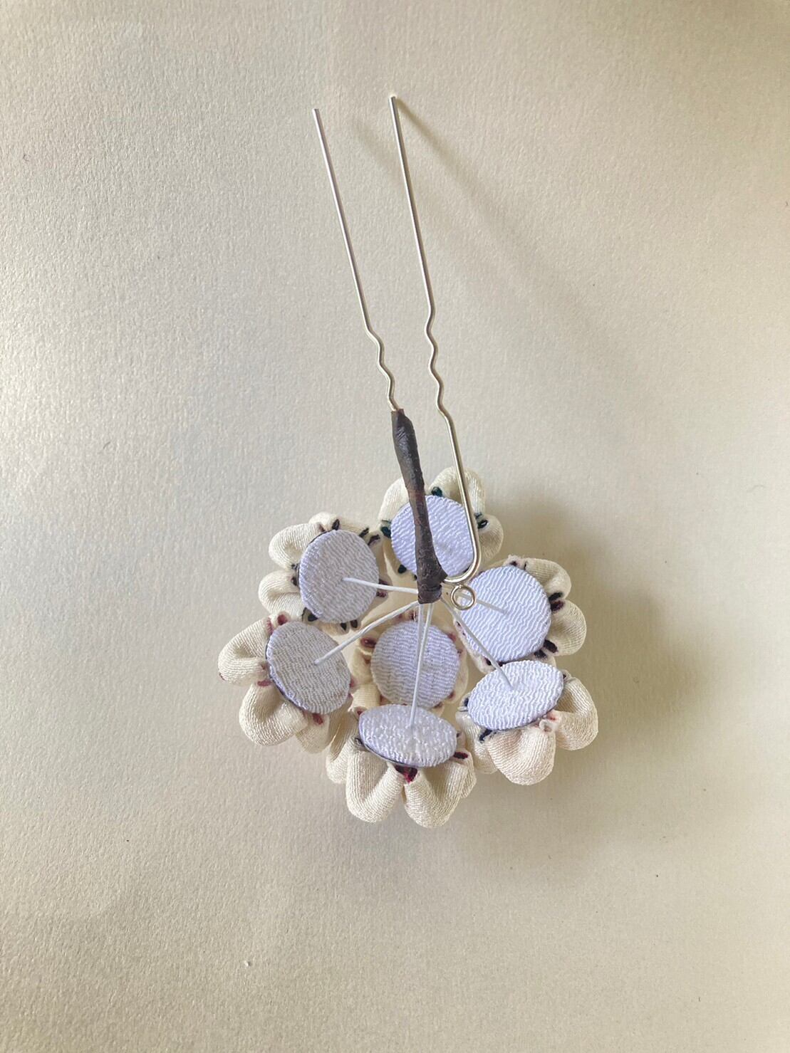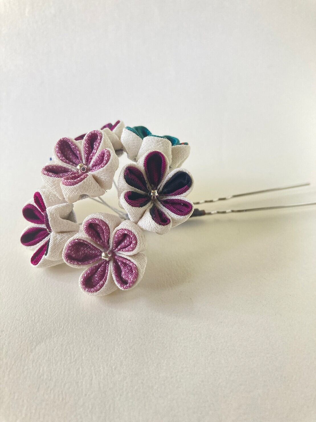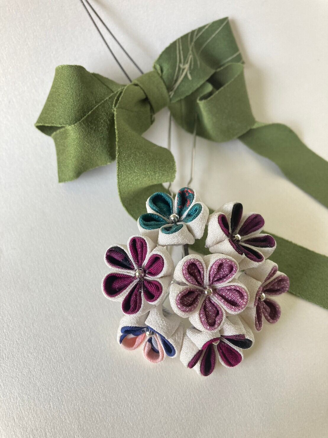 絹の着物生地を使って作ったブーケ型のつまみ細工髪飾りです。全体的に渋い色味を使って古典的な雰囲気に仕上げました。お花の色はそれぞれちょっとずつ違っていますが、全体に調和がとれています。着物着用時はもちろん洋風の御召し物にもお勧めです。控えめながら豪華にヘアスタイルを飾ります。