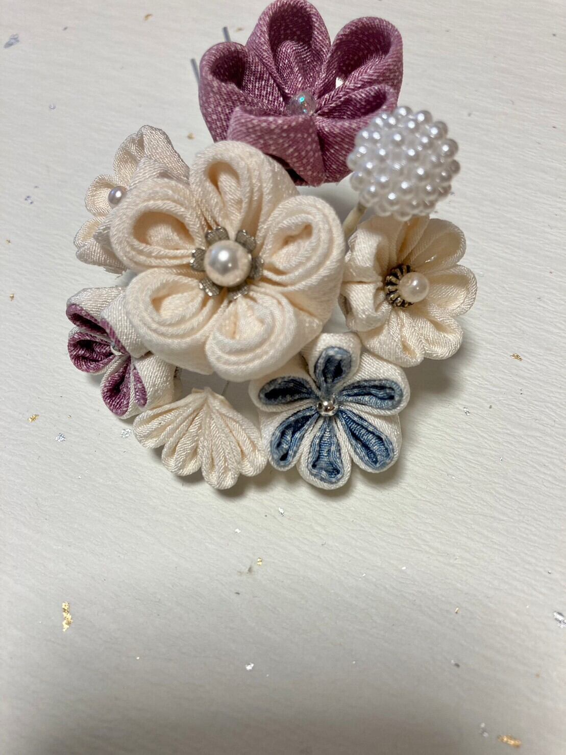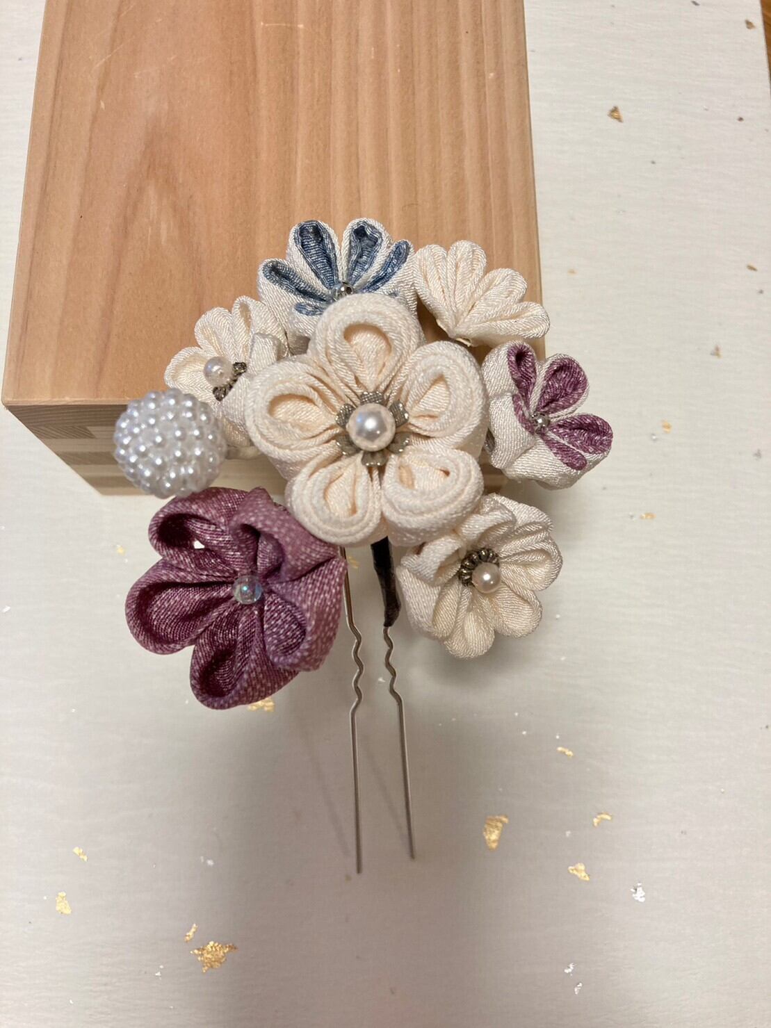 白を基調としたつまみ細工かんざしです。着物生地シルクを使って作った大小のお花やビーズ玉をバランスよく配置しました。 和風だけでなく洋風のドレスアップにもおすすめです。